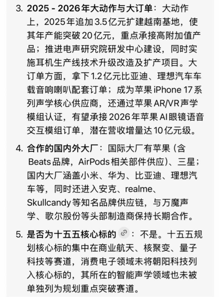 $朝阳科技(SZ002981)$ 根本不用担心朝阳科技炸不炸板,走到现在已经强的可怕了。Ai耳机的龙头企业,合作的企业全部是知名的不能再知名的:苹果、华为、小米,三星等,甚至知名车企:比亚迪、理想等合作还在前进中。越南新建的厂有望承接2026年苹果AI眼镜语音交互模组订单,潜在营收增量达10亿元级。今年三季报营收利润双双暴增,市净率还低,拿着等创新高吧。必创新高。立帖为证,有本事你就砸死我!
