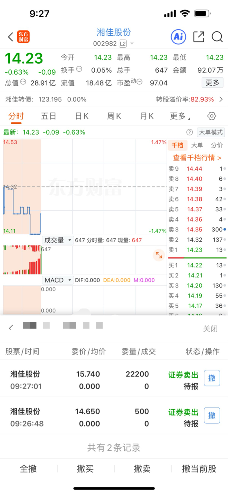 $湘佳股份(SZ002982)$ 把昨天14.66没卖掉的500股继续挂上去,篝庄来吃掉啊