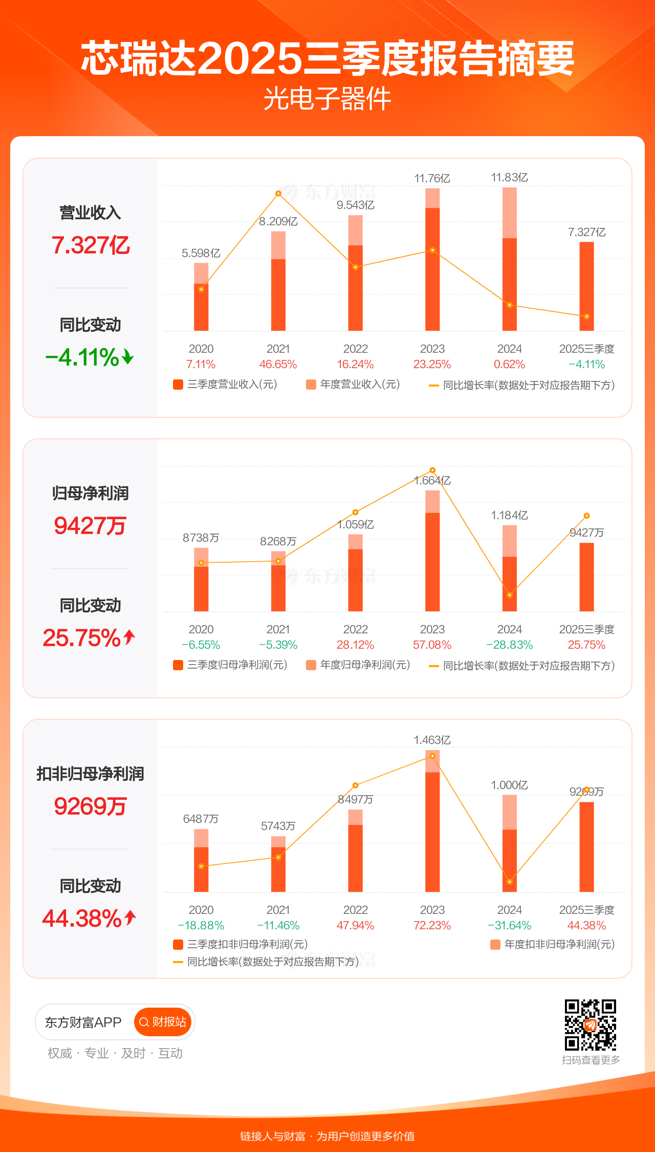 芯瑞达10月31日发布2025年三季报显示,公司前三季实现营业收入7.33亿元,同比下滑4.11%;归母净利润9427.41万元,同比增长25.75%;扣非归母净利润9269.42万元,同比增长44.38%。