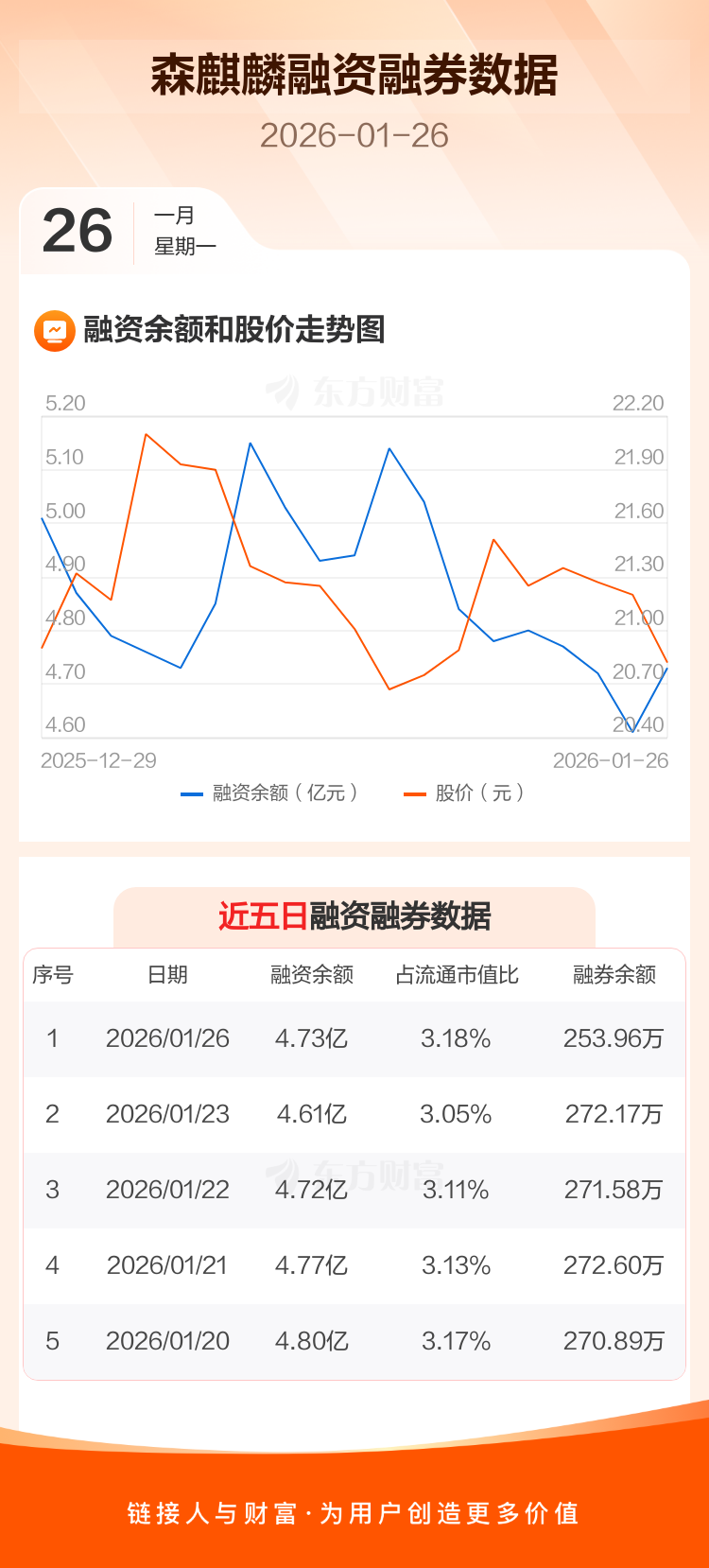 交易所最新数据显示,森麒麟于2026年1月26日获融资买入2834.76万元,融资偿还1722.63万元,当日融资净买入1112.12万元。目前,该股融资余额4.73亿,占流通市值比例为3.18%。