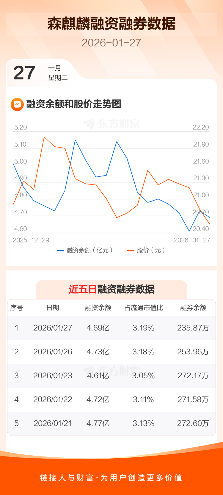 交易所最新数据显示,森麒麟于2026年1月27日获融资买入2089.90万元,融资偿还2494.88万元,当日融资净偿还404.98万元。目前,该股融资余额4.69亿,占流通市值比例为3.19%。