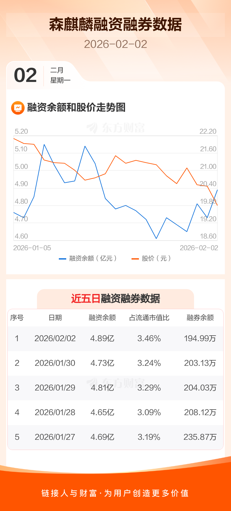 交易所最新数据显示,森麒麟于2026年2月2日获融资买入3444.12万元,融资偿还1868.75万元,当日融资净买入1575.37万元。目前,该股融资余额4.89亿,占流通市值比例为3.46%。