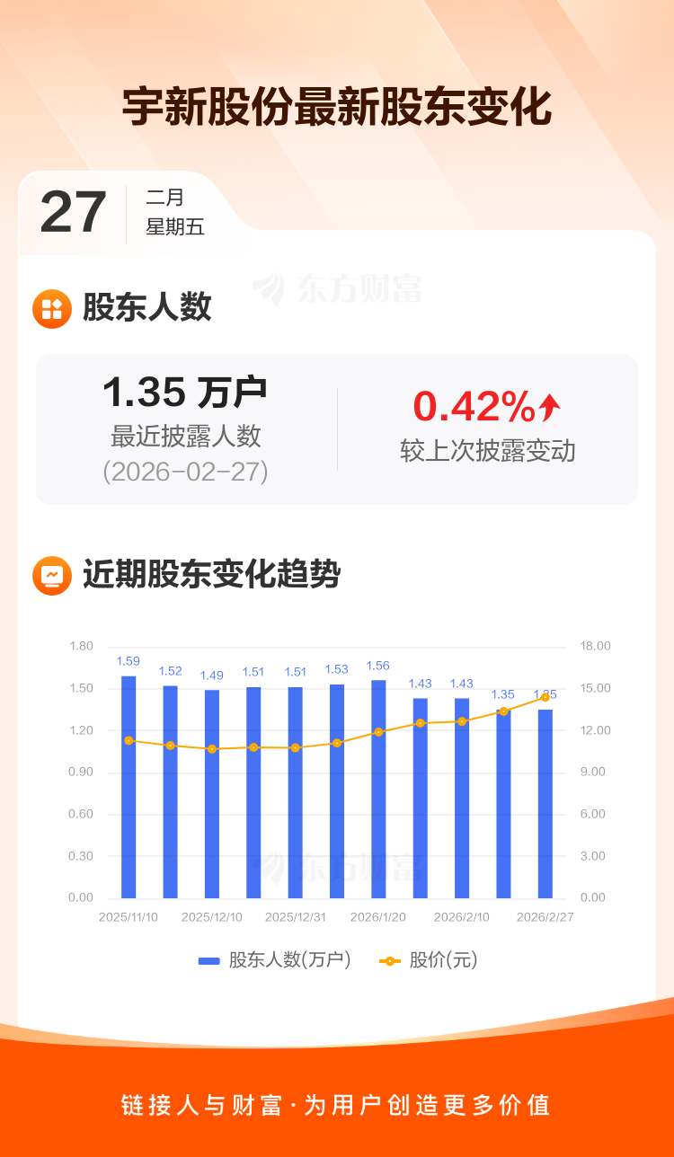 宇新股份:截至2月27日最新股东户数1.35万户,较上期增加0.42%