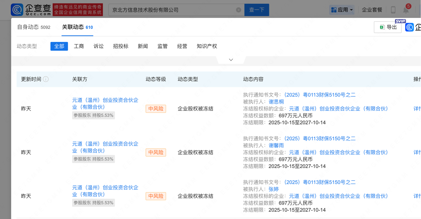 $京北方(SZ002987)$ 昨日股东被冻结2000万