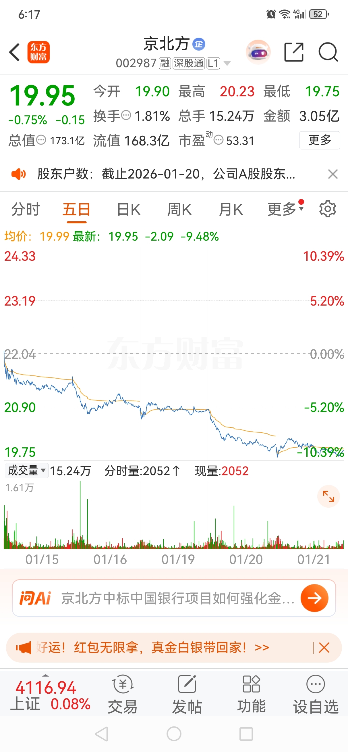 $京北方(SZ002987)$ 五天都跌了10个点,现在是不是要反弹一下。要不就再跌9毛5,直接来到19块。加仓痛快点。直接躺平到明年。