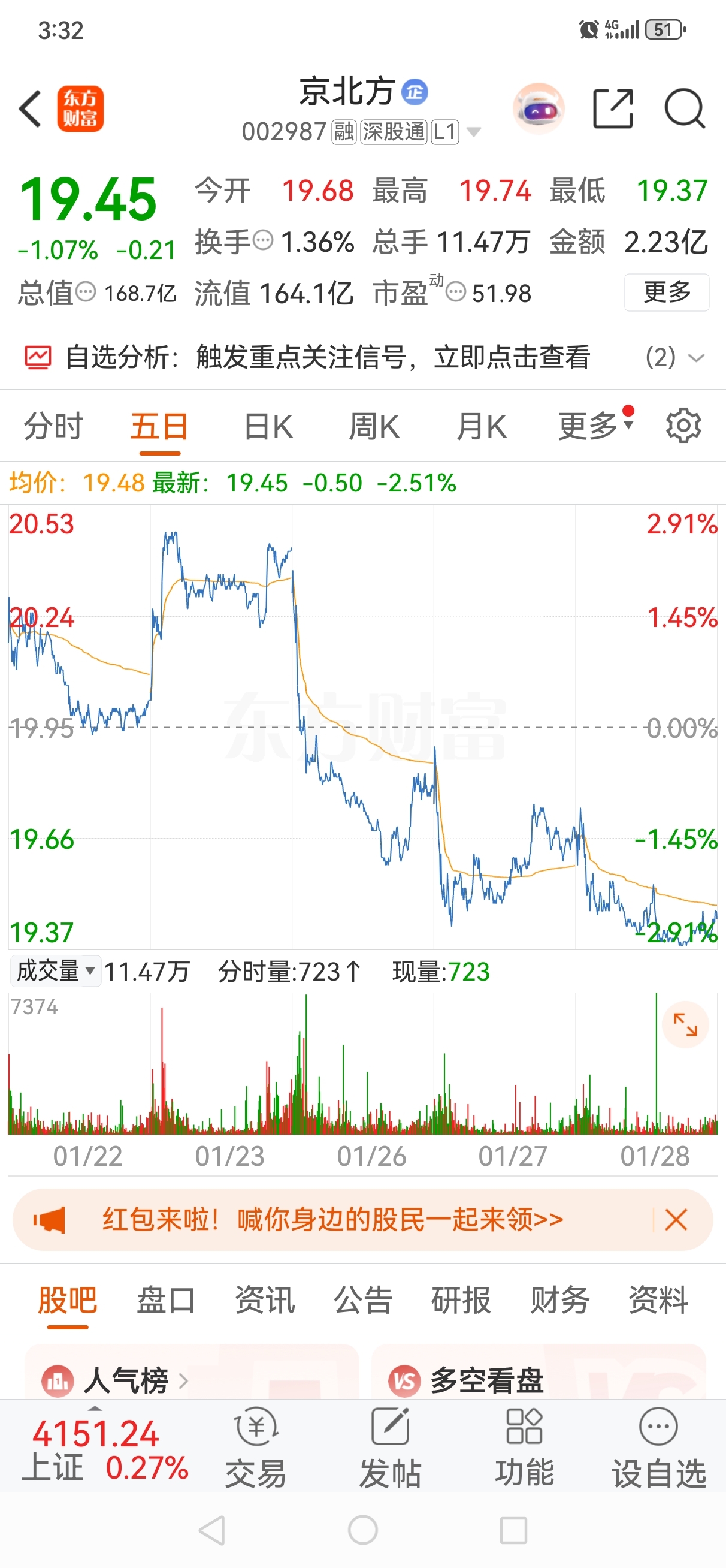 $京北方(SZ002987)$ 20.5的本,也才6个点,就当追高了一个大妖股。拿了一个礼拜,一天一个点。