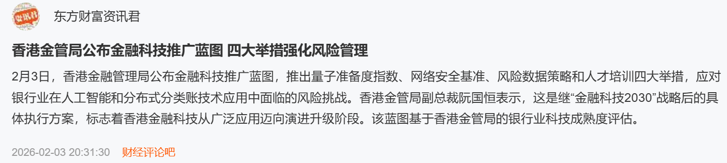 香港金融管理局2月3日公布金融科技推广蓝图,提出推动负责任创新及进阶应用金融科技。未来数月,香港金管局将推出四个旗舰项目,包括:量子准备度指数、全新风险数据策略、金融科技网络安全基准、资历发展支援。