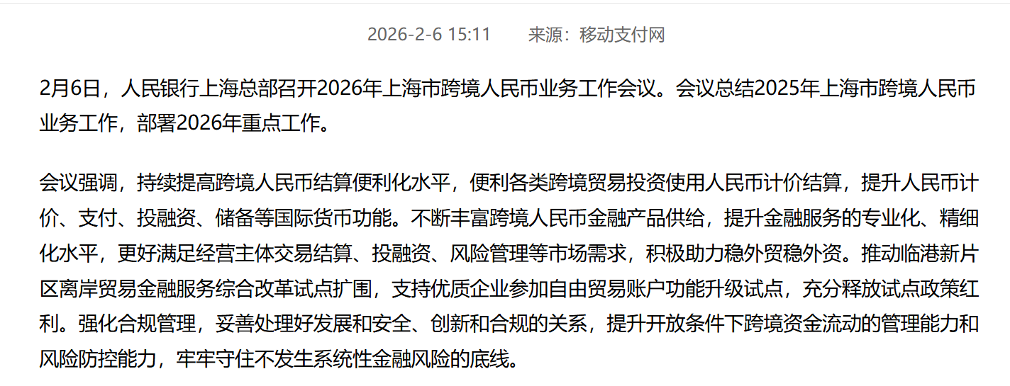 【盘后最新消息】人民银行上海总部2月6日召开2026年跨境人民币业务工作会议。