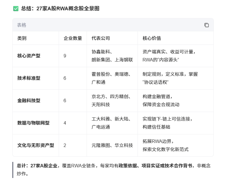 27家A股企业,覆盖RWA全链条,每家均有政策依据、项目实证或技术合作背书,非概念炒作。