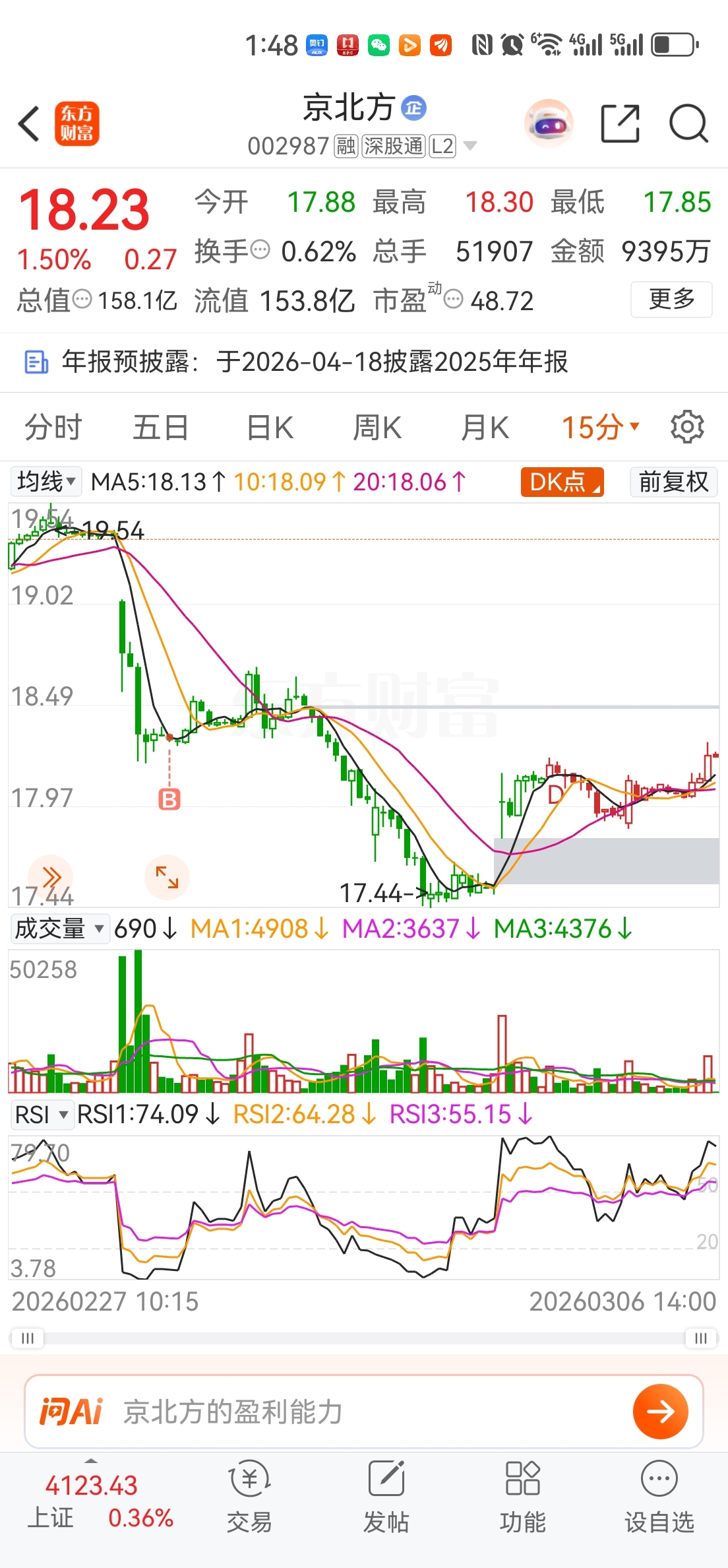 $京北方(SZ002987)$ 十五分钟线,刚刚出现d点信号。情绪回暖,如果持股,个人意见,可以拿着博反弹,短期看19.5,如果不能突破就走人。