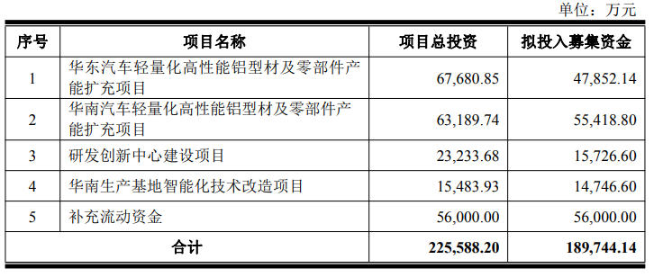 11月17日晚,豪美新材(002988)公告,公司拟向特定对象发行股票的募集资金总额不超过18.97亿元,用于华东汽车轻量化高性能铝型材及零部件产能扩充项目、华南汽车轻量化高性能铝型材及零部件产能扩充项目、研发创新中心建设项目、华南生产基地智能化技术改造项目及补充流动资金。