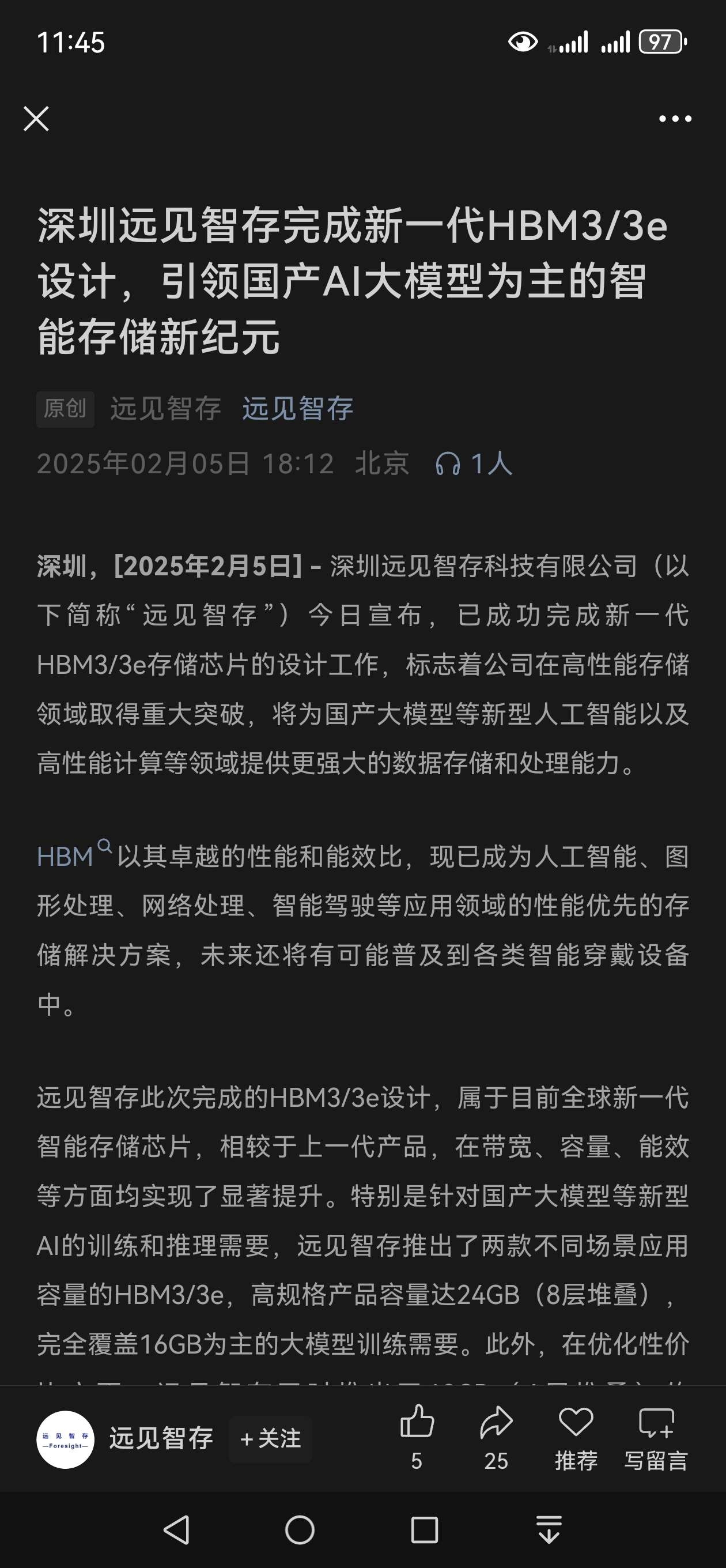 远见智存完成新一代HBM3/3e设计,引领国产AI大模型为主的智能存储新纪元