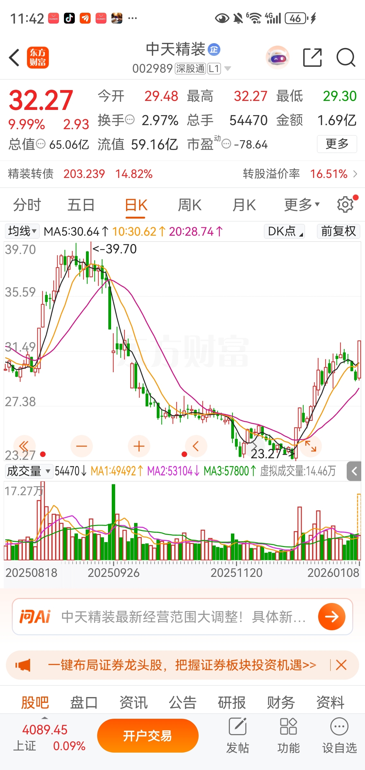 $中天精装(SZ002989)$ 回调几天想等到回踩20日线29附近挂单补仓,没想到一口气拉回去了,挺牛的12月份就一直看好你到32今天到了,可惜没守住卖飞了