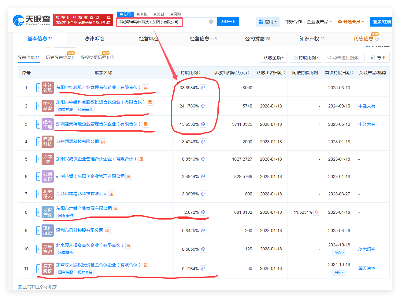 中天精装对科睿斯半导体拥有39.8%=24.17%+15.63%投票话语权,穿透计算间接持股比例为28%