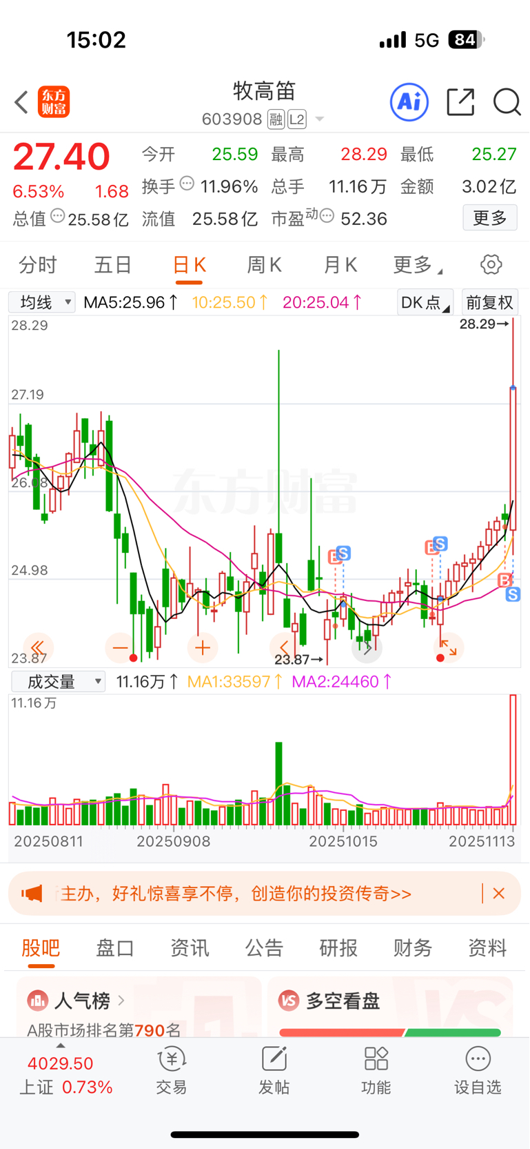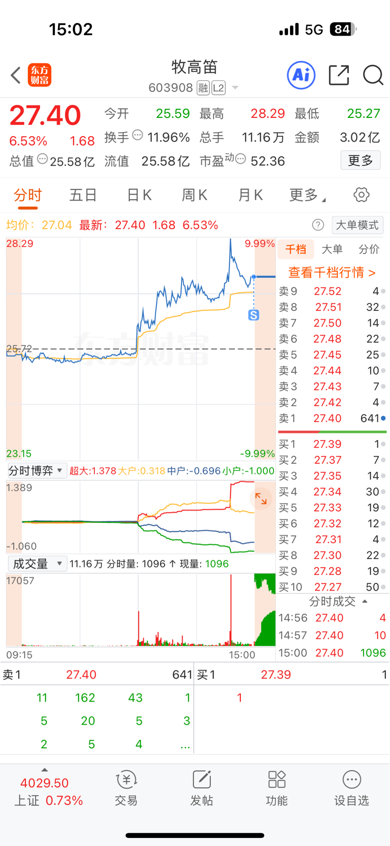 今天上午有事耽误了,阿甘开盘没低吸到,没有任何操作。高牧笛,下午我看着涨停了。我