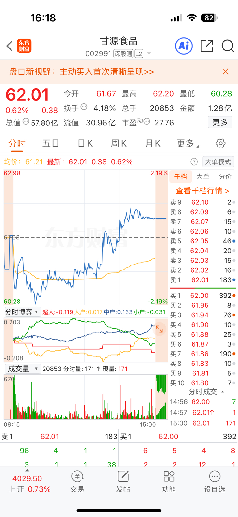 $甘源食品(SZ002991)$ 今天上午有事耽误了,阿甘开盘没低吸到,没有任何操作。高牧笛,下午我看着涨停了。我贪心了,犹豫了。真想抽自己几个大嘴巴。少挣好几千块钱。下次严格执行!知心合一!