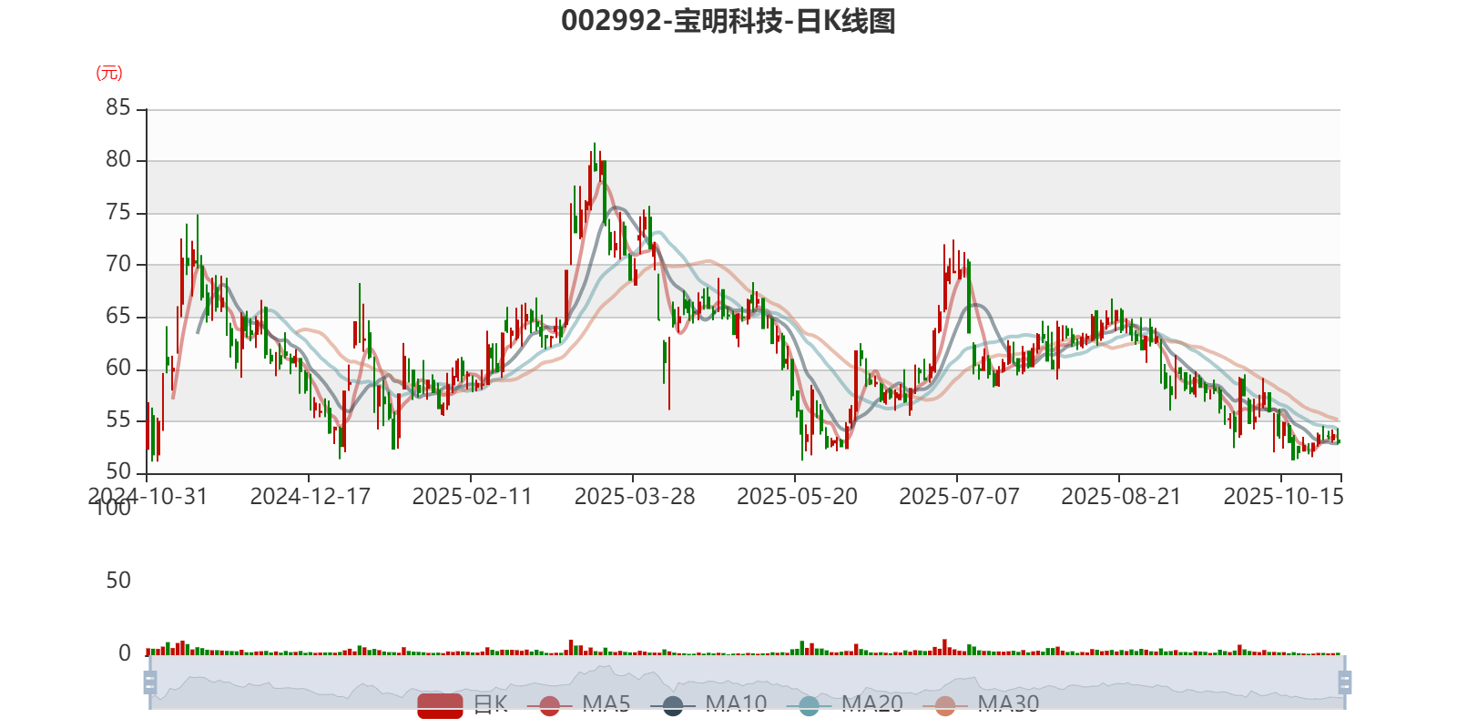 中证智能财讯宝明科技(002992)10月31日披露2025年第三季度报告。前三季度公司实现营业总收入9.99亿元,同比下降7.55%;归母净利润亏损502.44万元,上年同期亏损7345.43万元;扣非净利润亏损549.9万元,上年同期亏损8277.2万元;经营活动产生的现金流量净额为2946.93万元,同比增长69.38%;报告期内,宝明科技基本每股收益为-0.03元,加权平均净资产收益率为-0.69%。