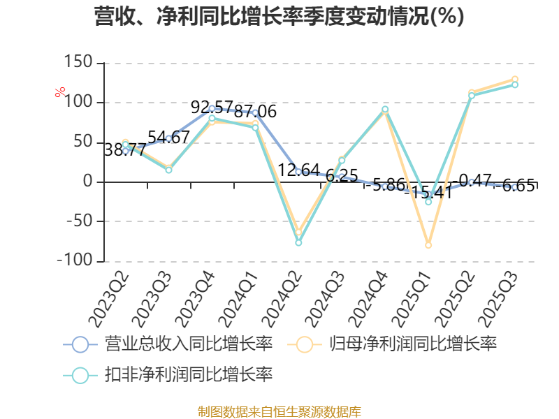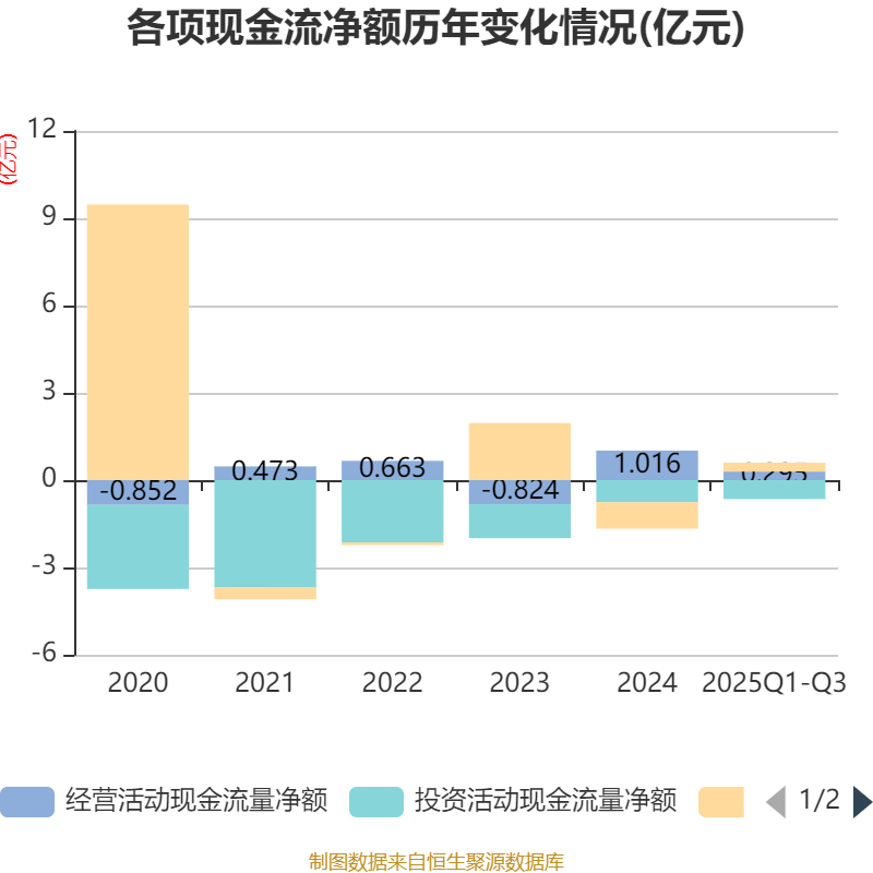 2025年前三季度,公司经营活动现金流净额为2946.93万元,同比增长69.38%;筹资活动现金流净额3070.71万元,同比增加4960.78万元;投资活动现金流净额-6501.18万元,上年同期为-1.01亿元。