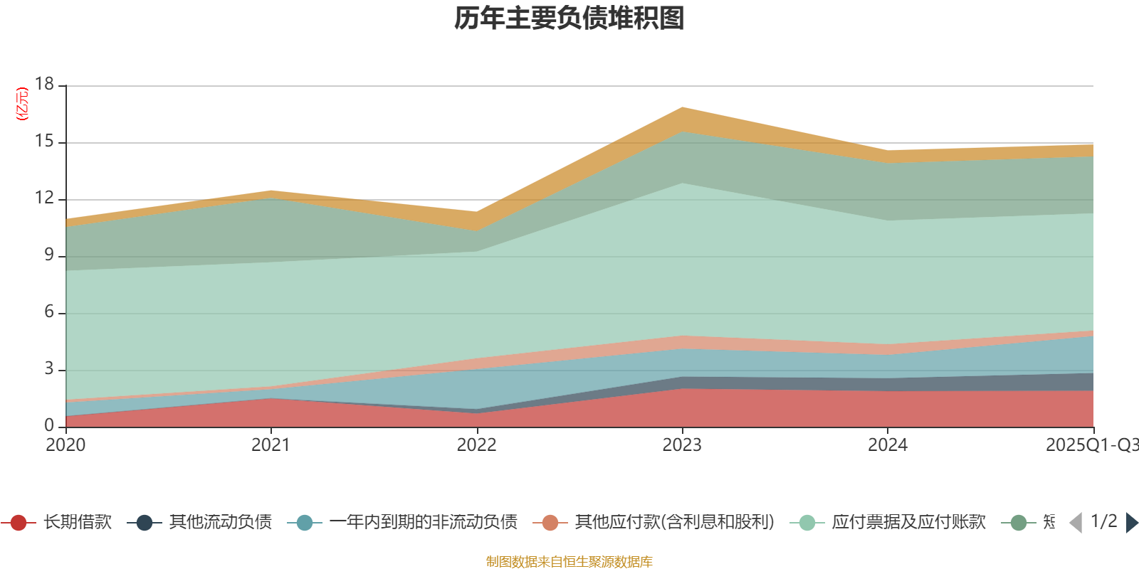 负债重大变化方面,截至2025年三季度末,公司一年内到期的非流动负债较上年末增加58.7%,占公司总资产比重上升3.16个百分点;应付票据及应付账款较上年末减少5.2%,占公司总资产比重下降1.91个百分点;其他应付款(含利息和股利)较上年末减少48.08%,占公司总资产比重下降1.26个百分点;其他流动负债较上年末增加38.29%,占公司总资产比重上升1.12个百分点。