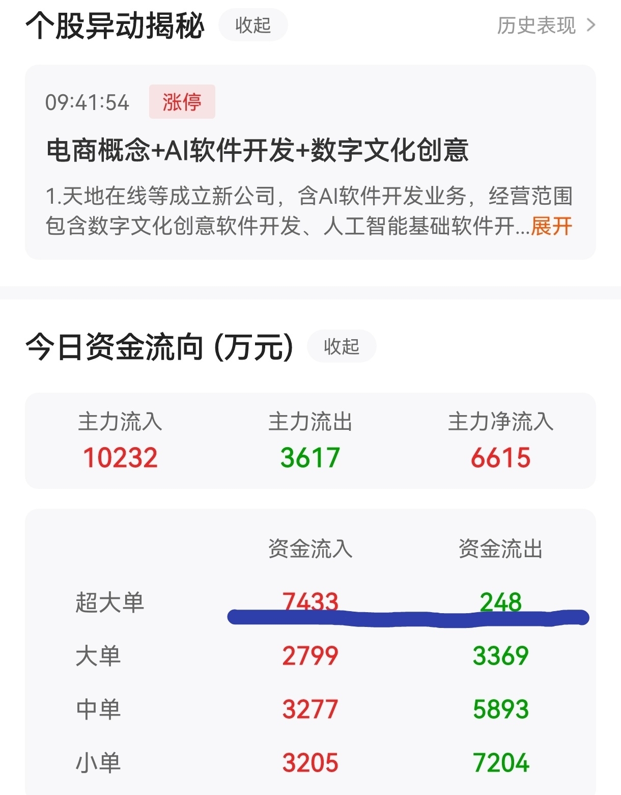 $天地在线(SZ002995)$ 成交1.71亿,超大单流入0.72亿,占比42%!望主力不可沽名学霸王,每次一个涨停后就拉稀!