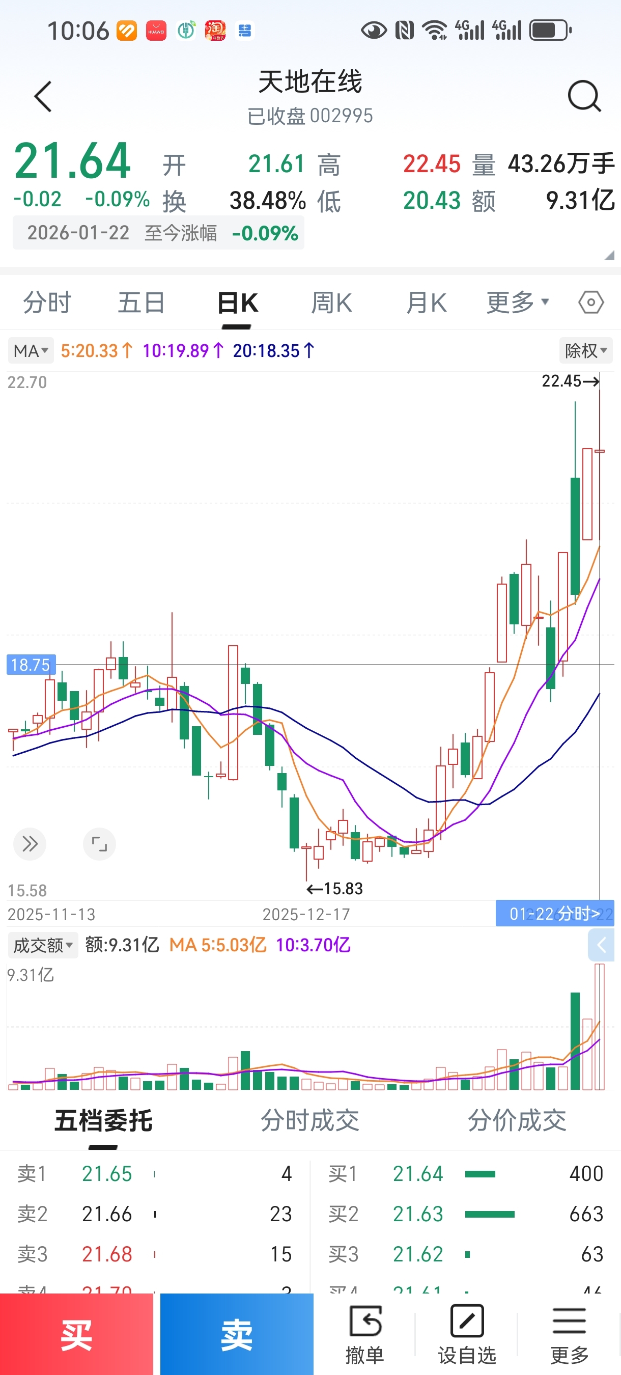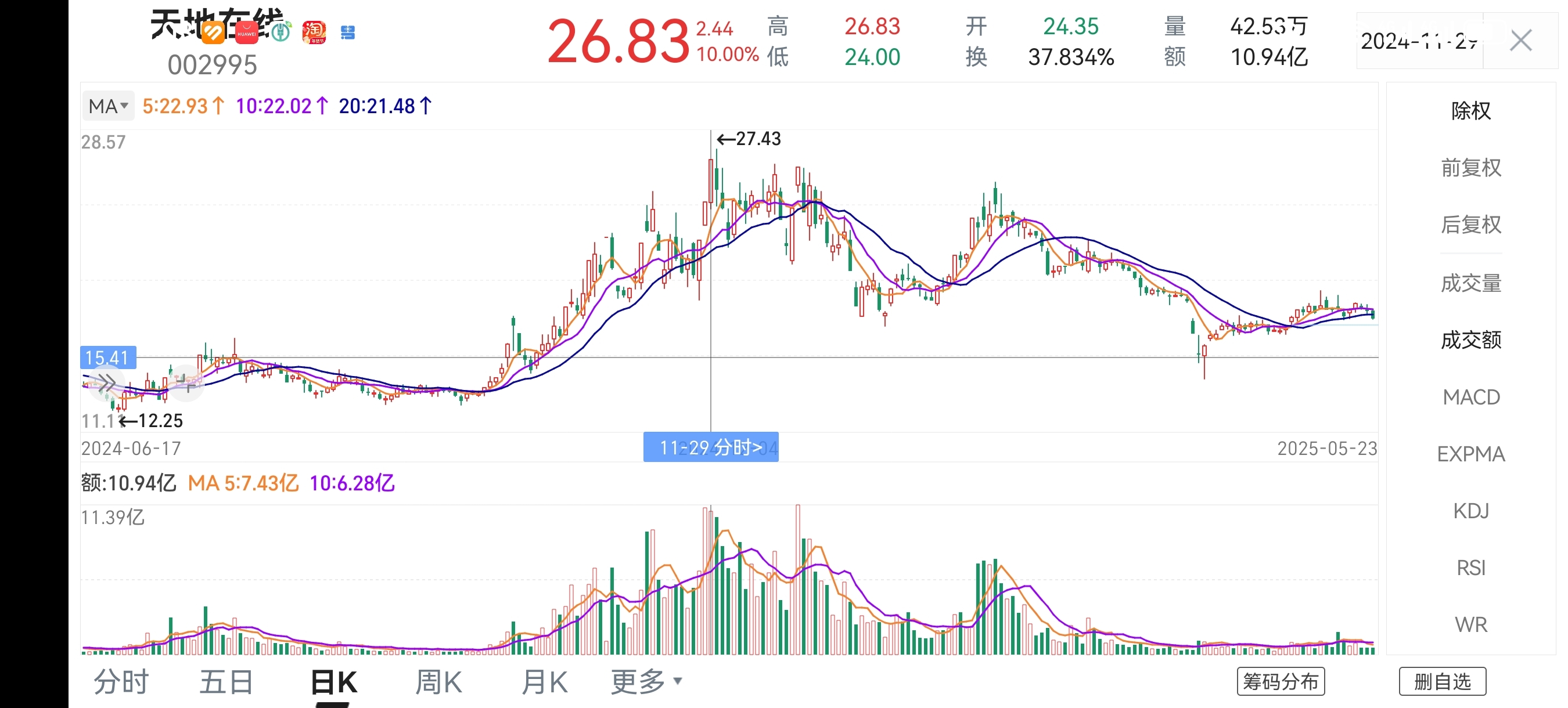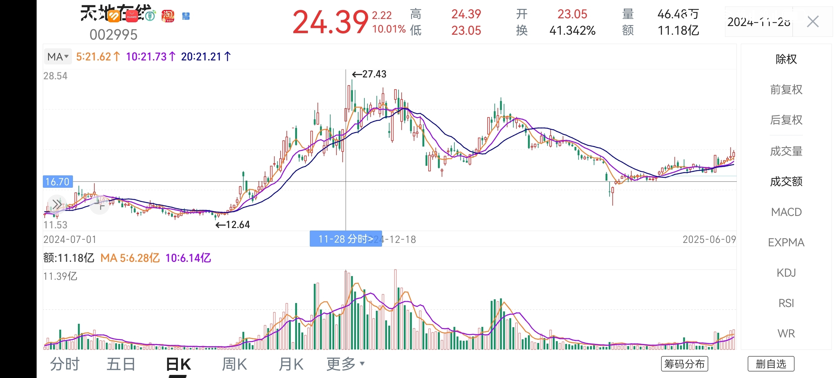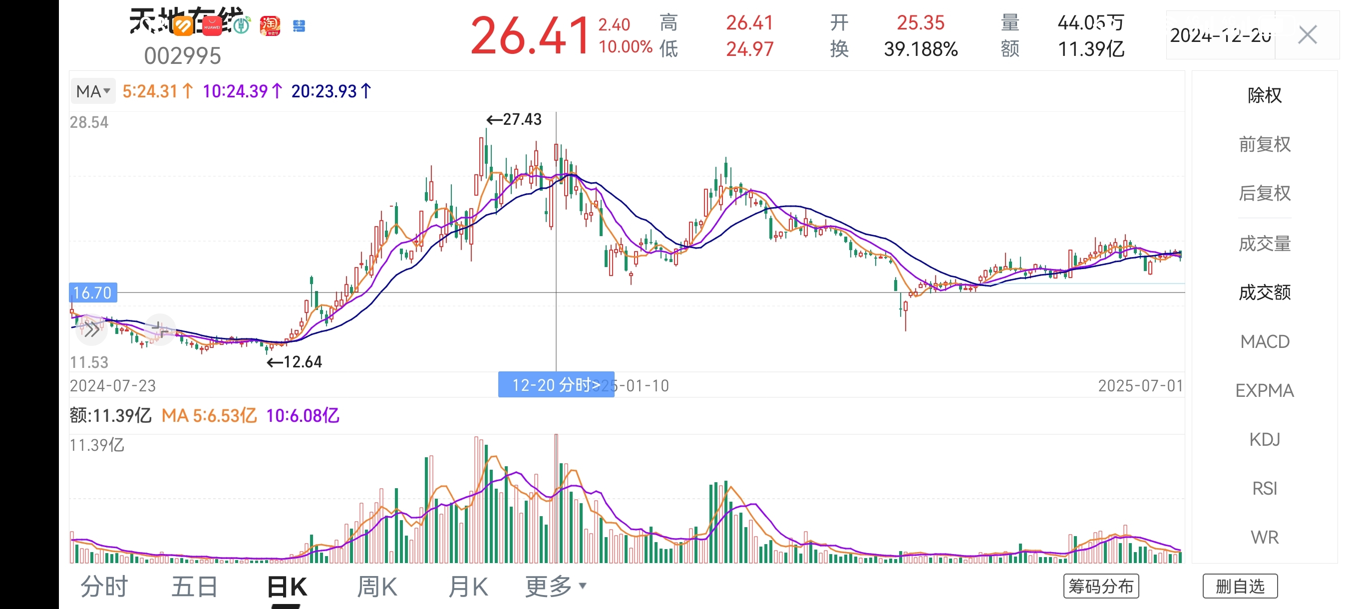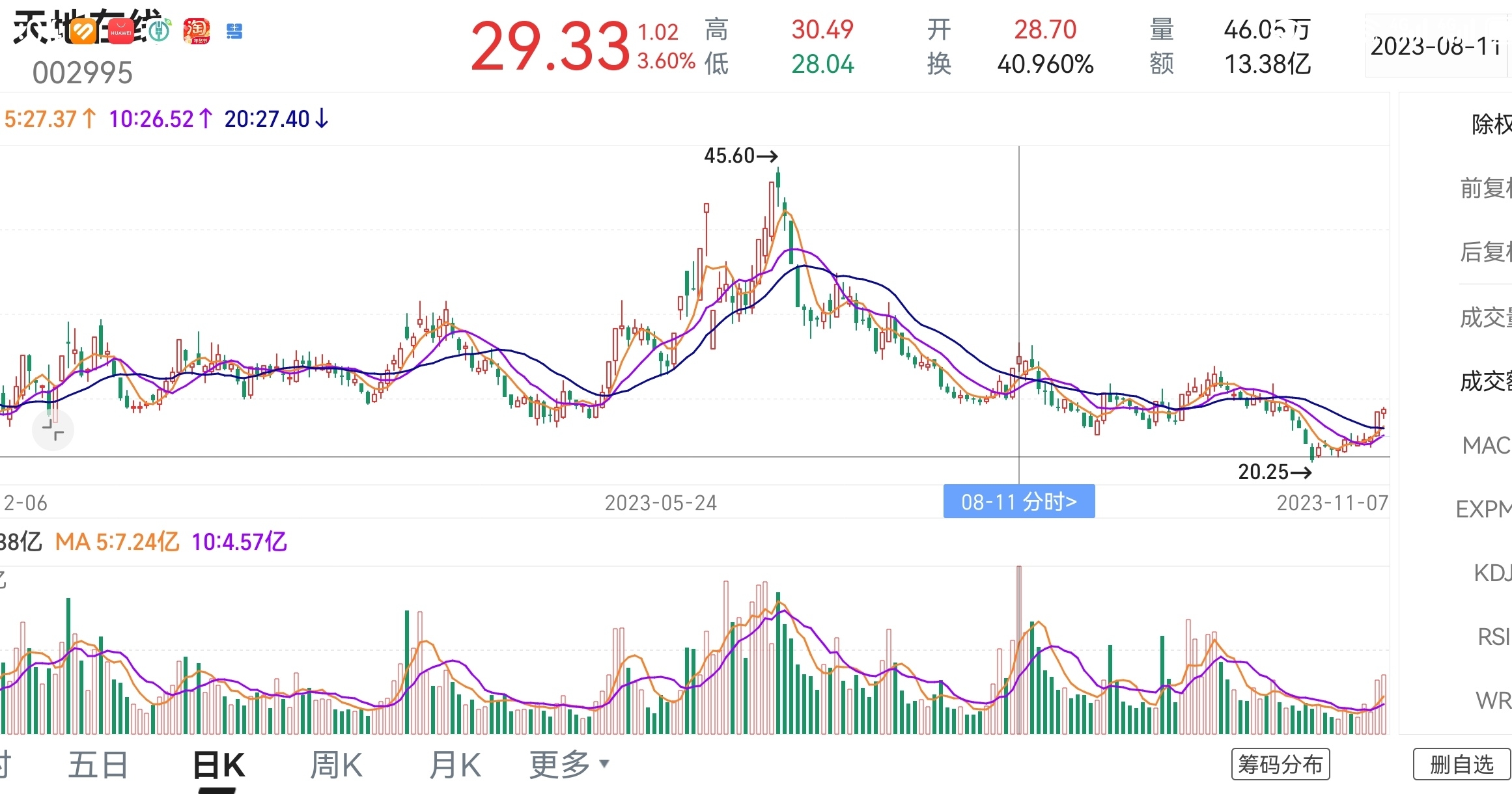 今天的成交量排在天地在线2020年8月份上市以来最大成交量第4位!及其他5次历史