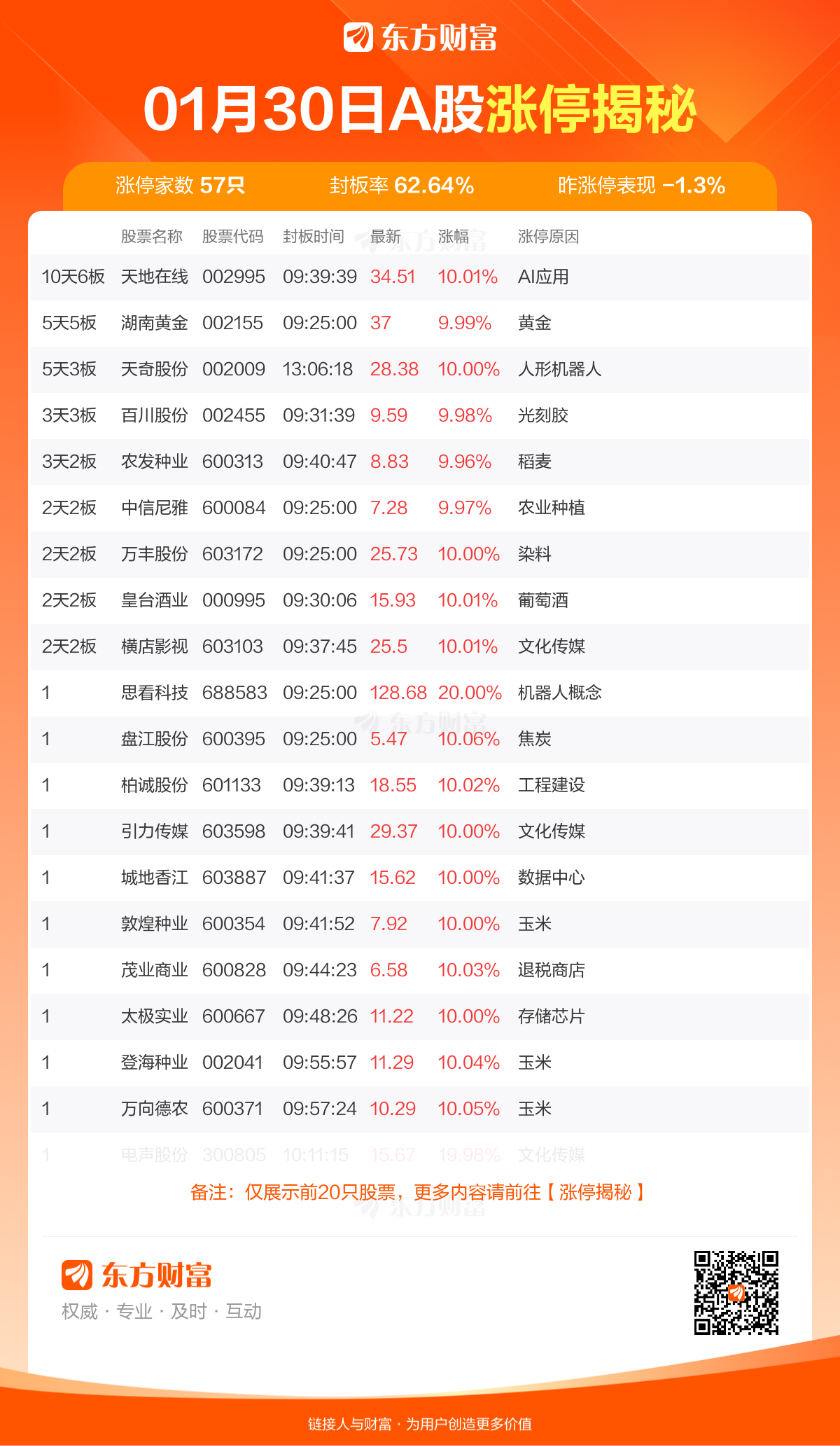 【白酒】部分茅台经销商已到货的飞天茅台一月和二月配额已售罄。 【有色金属】黄金涨破5600美元/盎司,白银涨破120美元/盎司,铜涨破14000美元。 【油气】美国总统特朗普正考虑对伊朗发动新的重大打击,一支庞大的舰队正前往伊朗。 【房地产】有房企告知其所在公司已不被监管部门要求每月上报“三条红线”指标。 【分散染料】分散染料核心中间体还原物的价格从2.5w飙涨50%至3.8w,推动了染料价格上涨。 【稀土】1月以来,稀土价格持续上涨,其中氧化钕、氧化镨价格均上涨超12万元/吨。 【商业航天】中国商火:坚决打赢主力箭首飞及回收攻坚战。潜伏机会