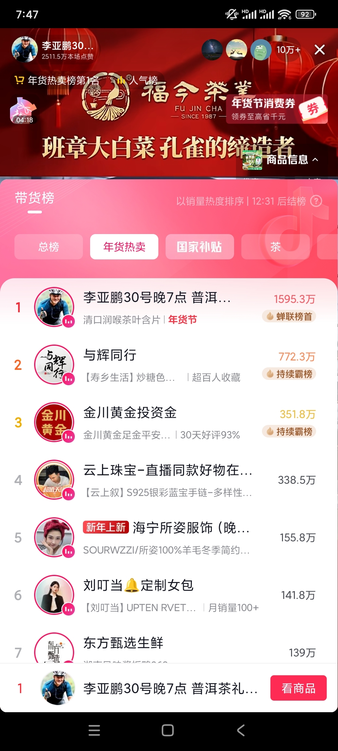 直播间人气第一,是董宇辉的两倍。