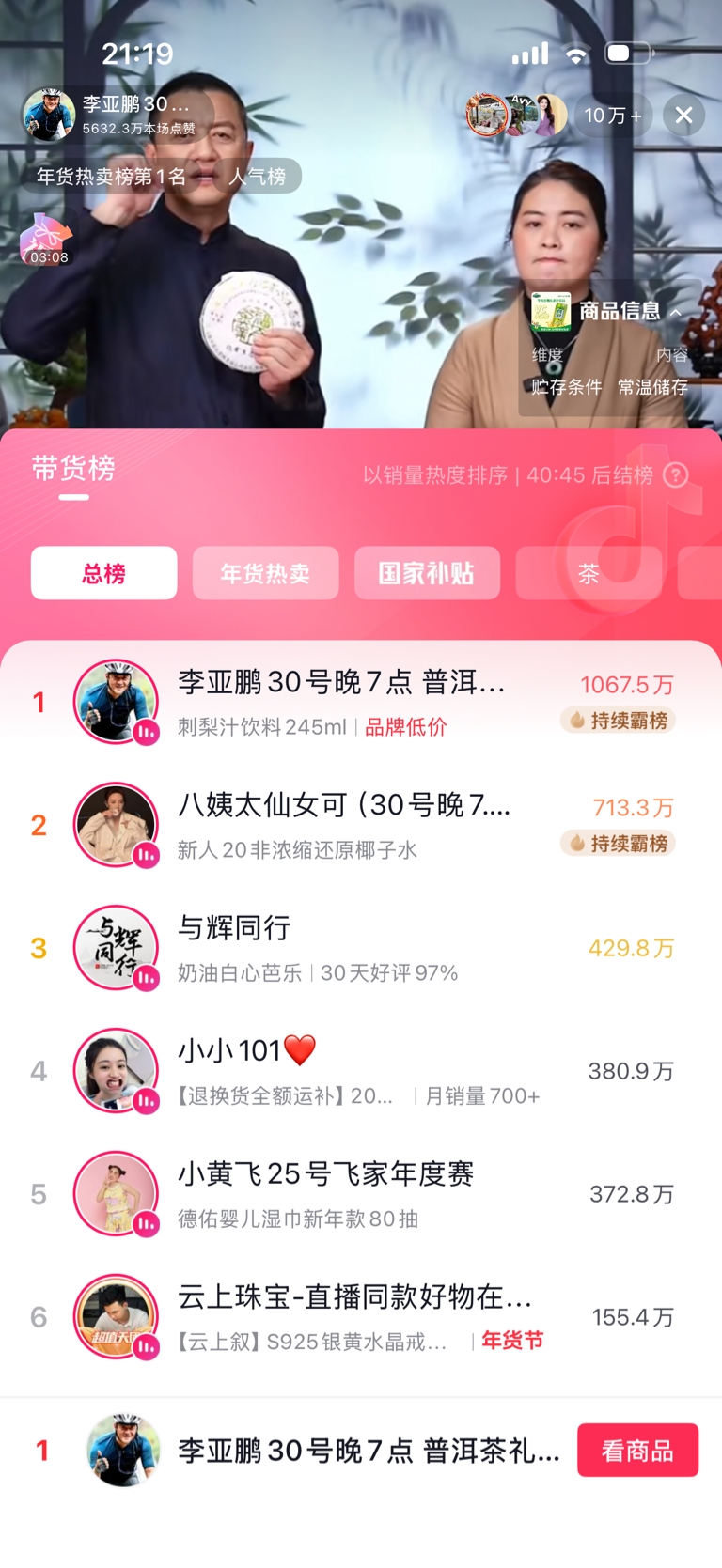 董宇辉在播,人气基本也都是鹏哥第一