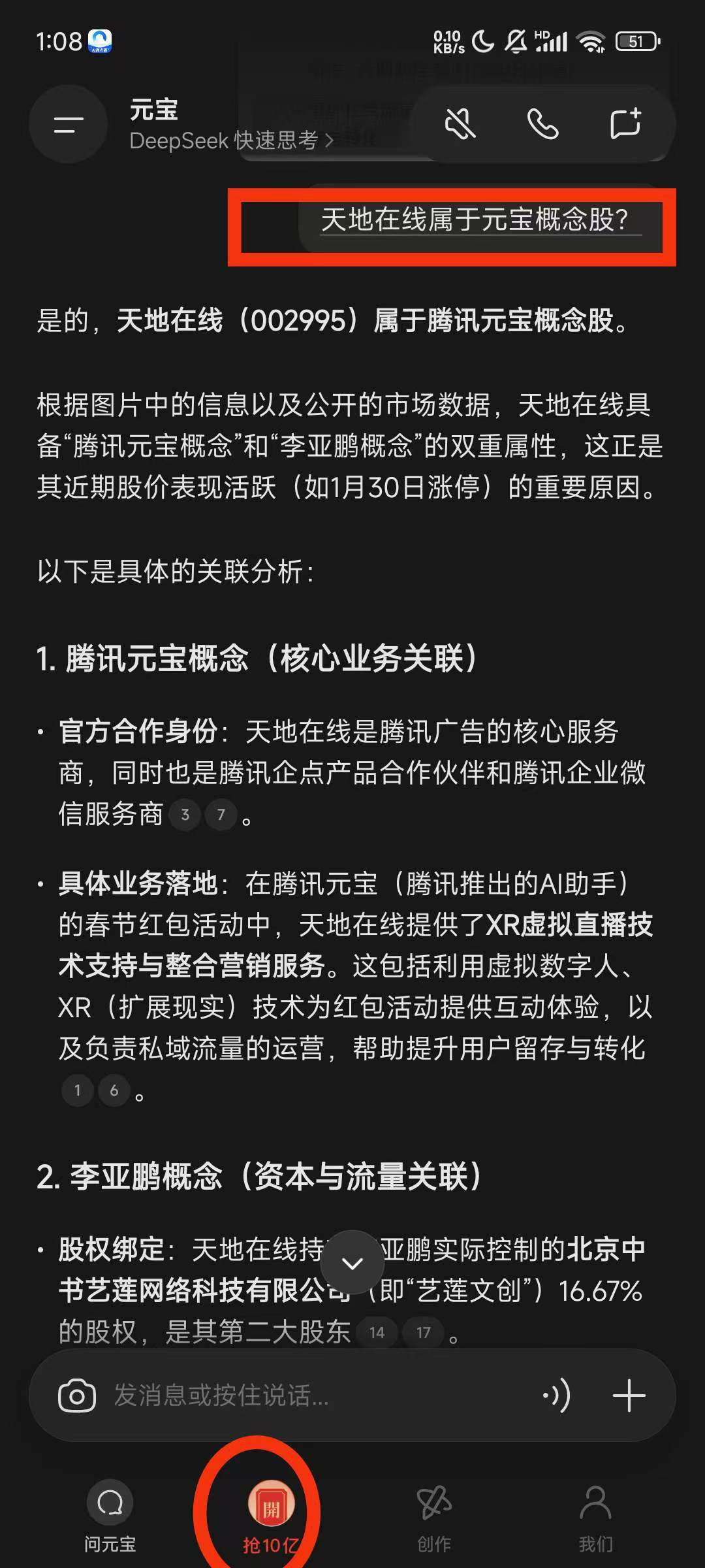 到时过年 朋友圈铺天盖地的腾讯元宝红包分享,又是元宝,又是李亚鹏,又是AI,这波拿到春节,挣的钱刚好直播间买鹏哥的年货,然后鹏哥又挣钱去公益,这不相当于我们也献爱心了
