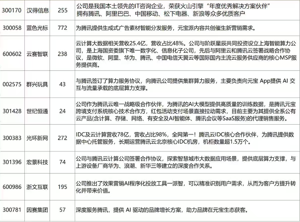 腾讯元宝概念股和之前AI应用的差不多,总得来说还是看几个核心,容量核心蓝色光标和利欧股份,情绪标的天地在线和浙文互联。
