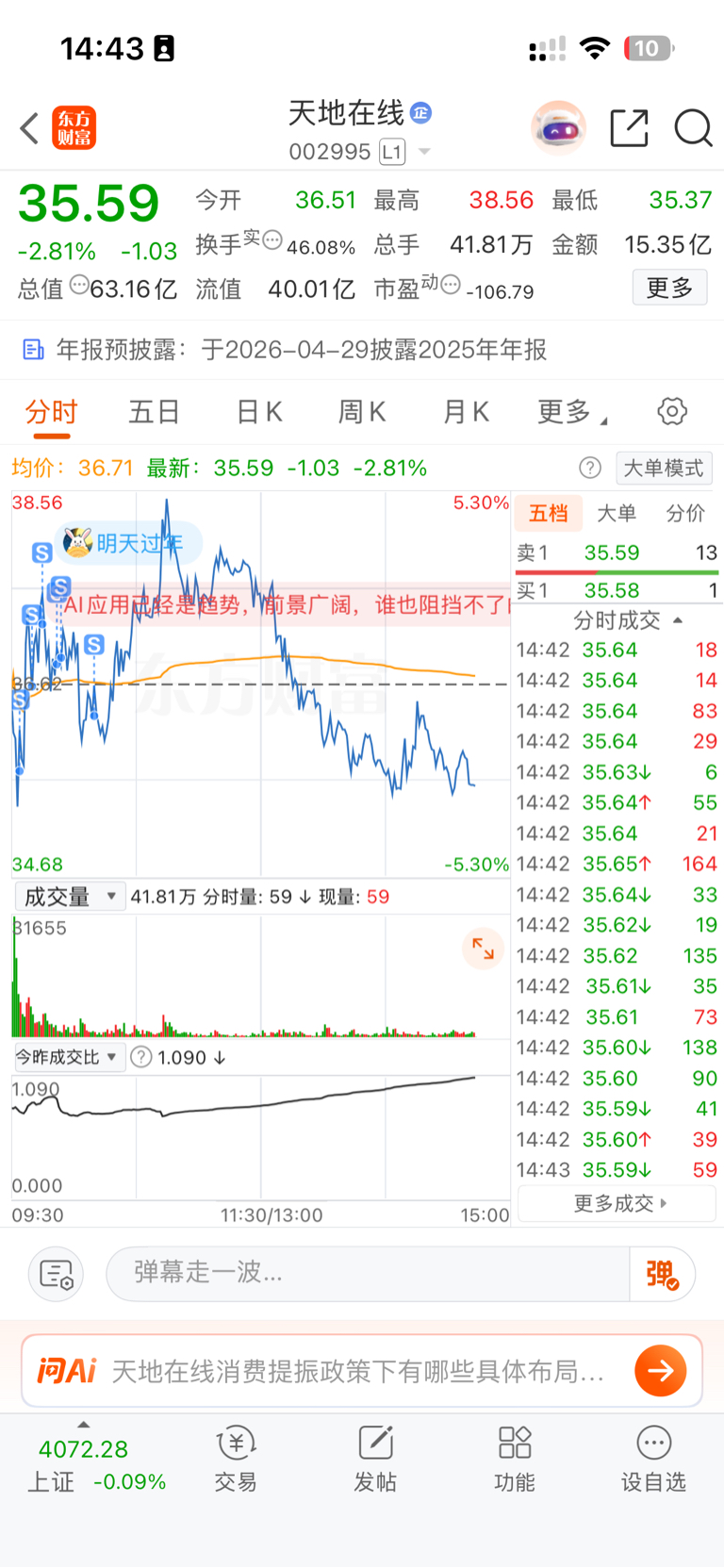 $天地在线(SZ002995)$ 早盘就卖了,明晚去买茶叶