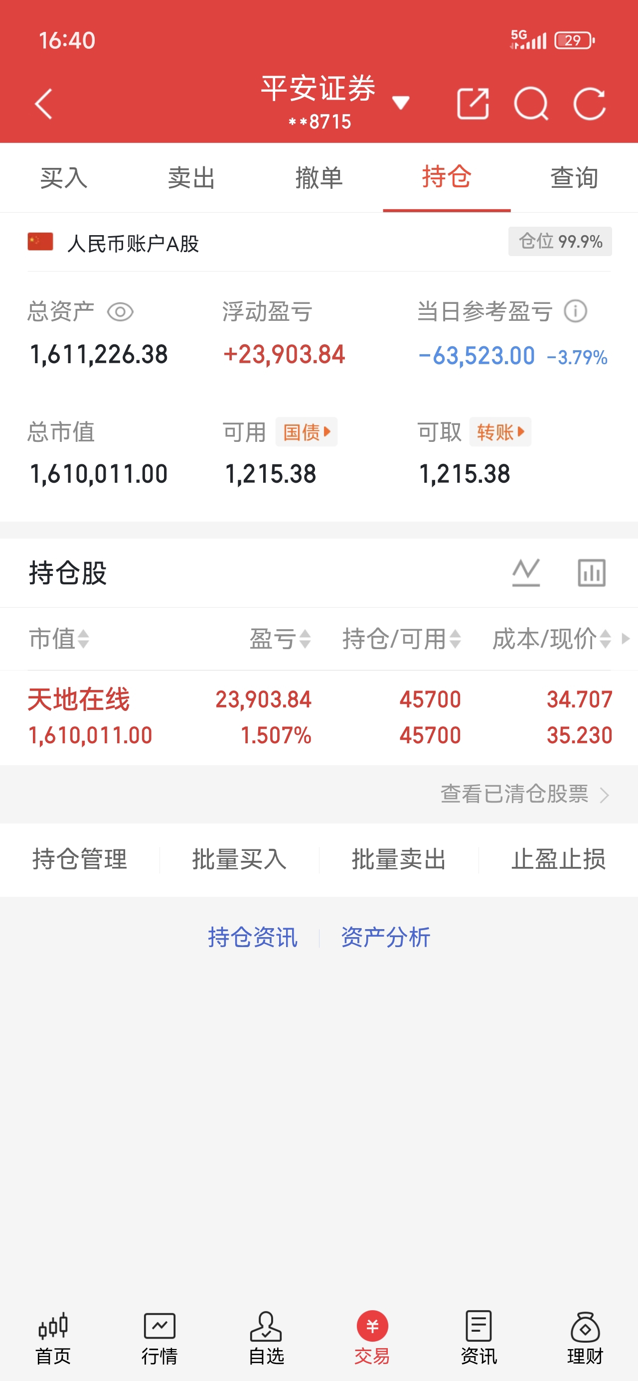 $天地在线(SZ002995)$ 昨日介入:今日股价表现疲软,收盘价报有所下调.较前一交易日显著下挫。尽管该股整体仍为持仓贡献了的浮动盈利,但单日的大幅回撤对账户净值造成了明显冲击。