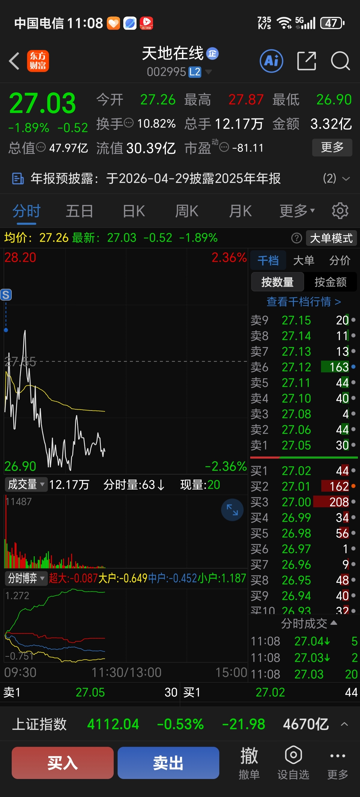 $天地在线(SZ002995)$ 买了它两天,昨天不断的加仓,今天冲高,坚决卖掉,只亏百把十块,不搞它了,还是有风险的,年后再看了。