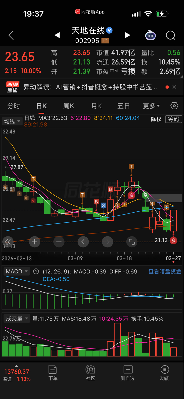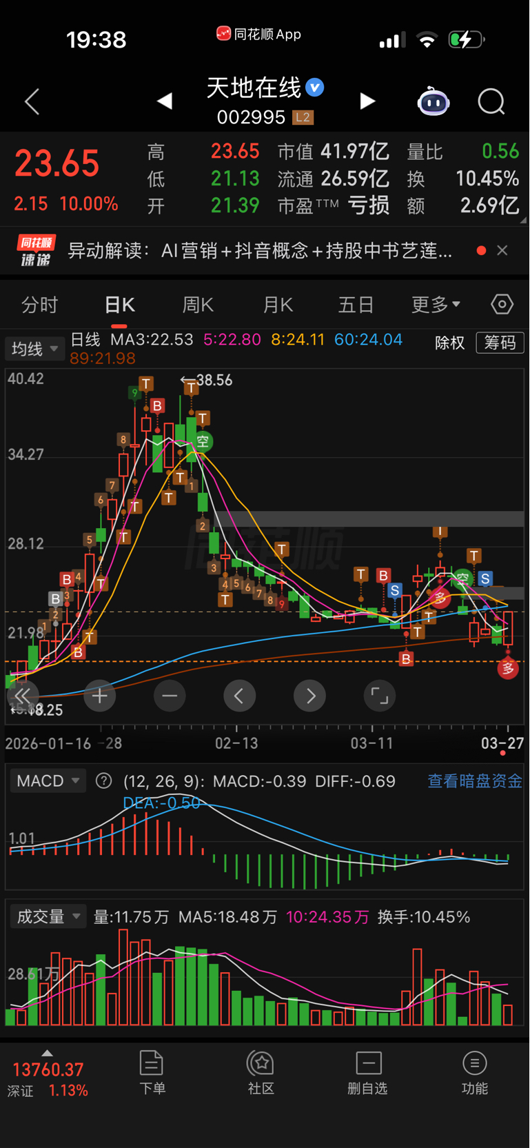 $天地在线(SZ002995)$ 上一波行情和预测一样,跌停都果断加仓,只是高点把盈利全部留在里面被动下跌有点多,上周一果断加仓横盘四天又被骗进去好多仓位,本周一无量跌停周二没多少子弹补仓了,本周最高亏损了18个点,坚持认为是主力挖坑,硬扛过来等待下周的起飞。