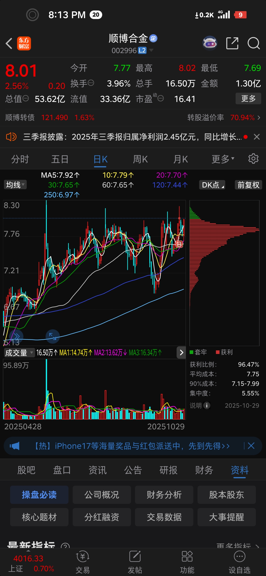 $顺博合金(SZ002996)$ 精准控盘,营收利润双丰收,股东人数减少,收盘价收在近几个月新高,铝价格很可能继续涨价,市值偏小,面临突破,筹码集中,只能说到这里了,万事俱备,只欠东风,涨不涨