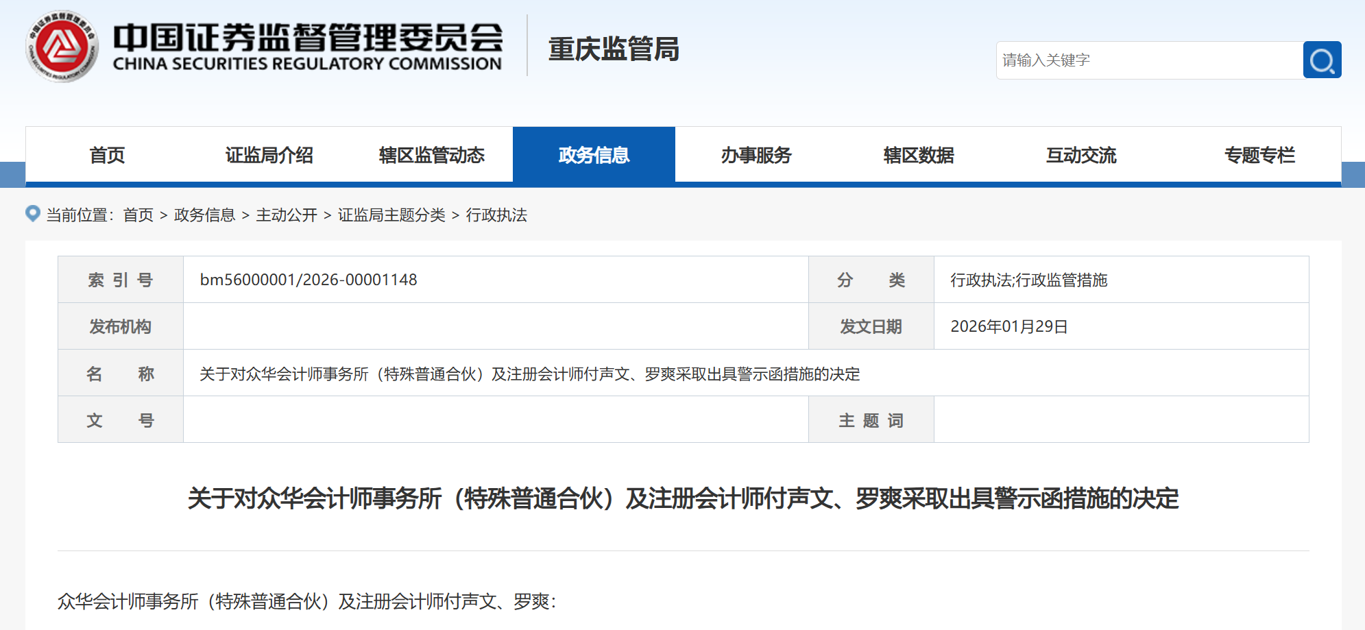 上述行为违反了《上市公司信息披露管理办法》(证监会令第182号,以下简称《信披办法》)第四十五条、第四十六条的相关规定。根据《信披办法》第五十五条的规定,重庆证监局决定对众华所及签字会计师付声文、罗爽采取出具警示函的行政监管措施,并记入证券期货市场诚信档案。你们应严格遵守《中国注册会计师审计准则》相关规定,进一步强化质量控制与复核,切实提高执业质量。