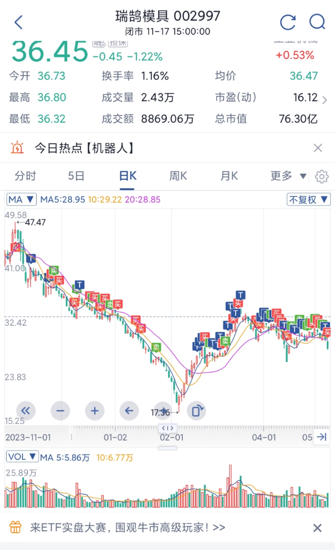 23年 瑞鹄模具惨痛的教训,快要发布智界汽车 ,前两个星期埋伏进去,重仓的,直接被埋。。。;之前在赛力斯赚到一波,后面买的瑞鹄41一直跌。。。补到没子弹,还不给反弹,刚好快过年了,被瑞鹄搞崩溃了,2个月没敢看仓位,你越补他越跌,从41跌到17, 瑞鹄这个票小心啊,跌起来不要命的。。。。