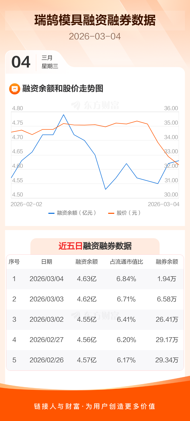 交易所最新数据显示,瑞鹄模具于2026年3月4日获融资买入791.31万元,融资偿还734.85万元,当日融资净买入56.45万元。目前,该股融资余额4.63亿,占流通市值比例为6.84%。