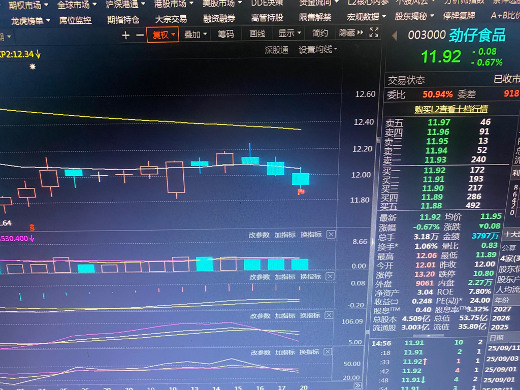 $劲仔食品(SZ003000)$ 劲仔昨天已发出中线卖出信号,考虑到股价昨天已跌破11.92元幸好能收回,若今天不出现一阳包三阴局面基本已毁了。基金持股5200多万股基本在9月30日前已跑光……中报后十多家机构推荐买入的结果。
