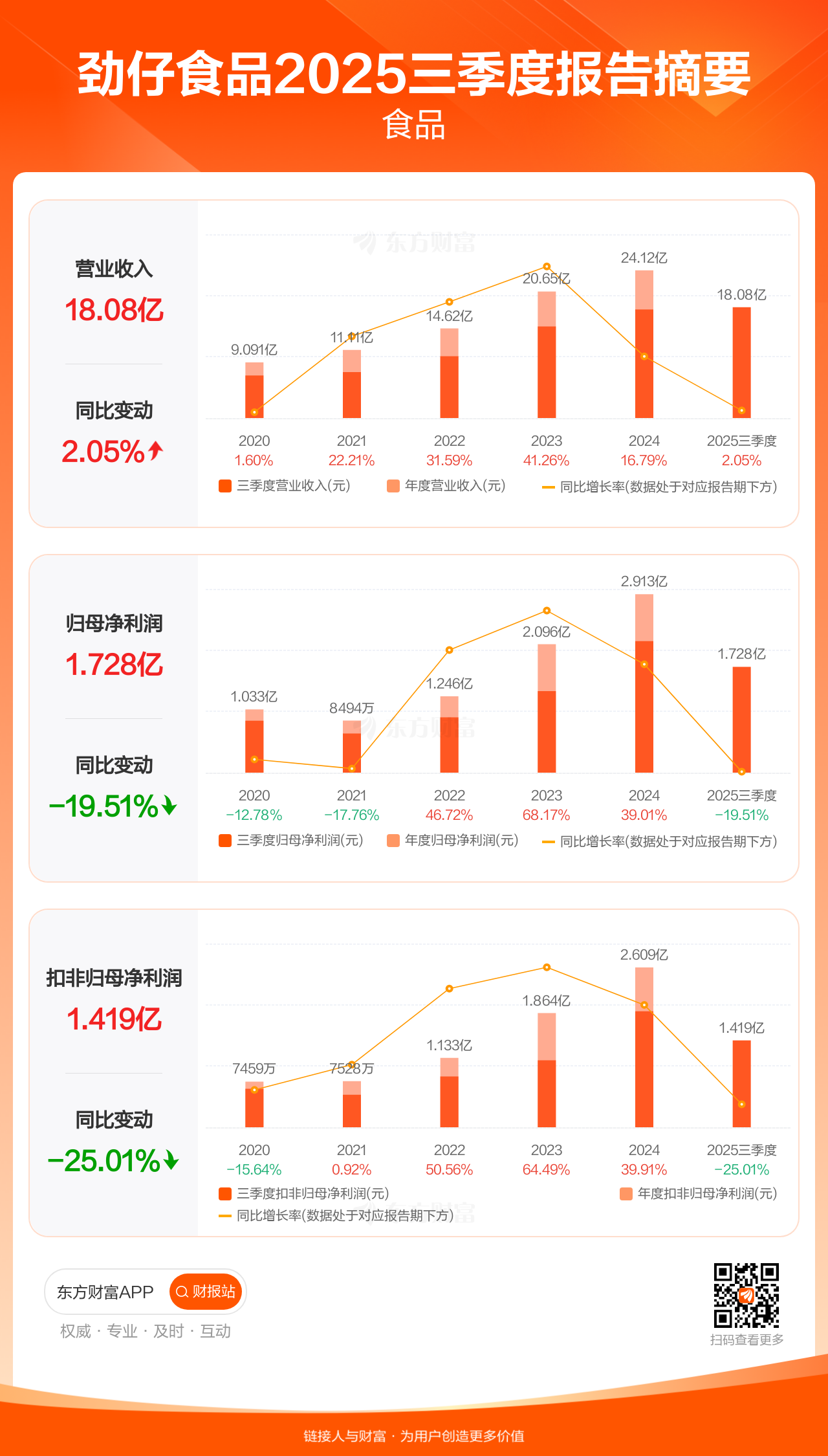 劲仔食品10月24日发布2025年三季报显示,公司前三季实现营业收入18.08亿元,同比增长2.05%;归母净利润1.73亿元,同比下滑19.51%;扣非归母净利润1.42亿元,同比下滑25.01%。