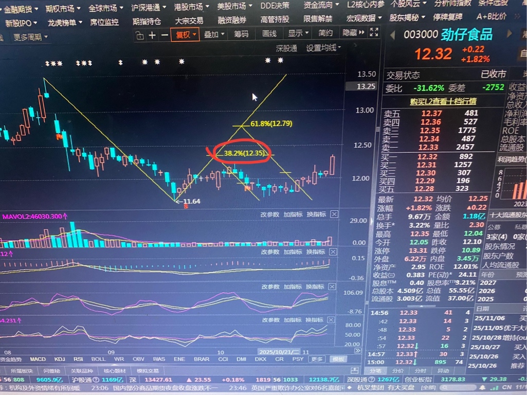 $劲仔食品(SZ003000)$ 劲仔不具备大幅反弹的条件,昨天冲击反弹的0.382位置受阻,今天若是下跌果断离场换股操作,若能有效站稳(13.49-11.64)×0.382+11.64=12.35元以上可看高一线,但始终目前十大流通股东的基金还是撤退的。