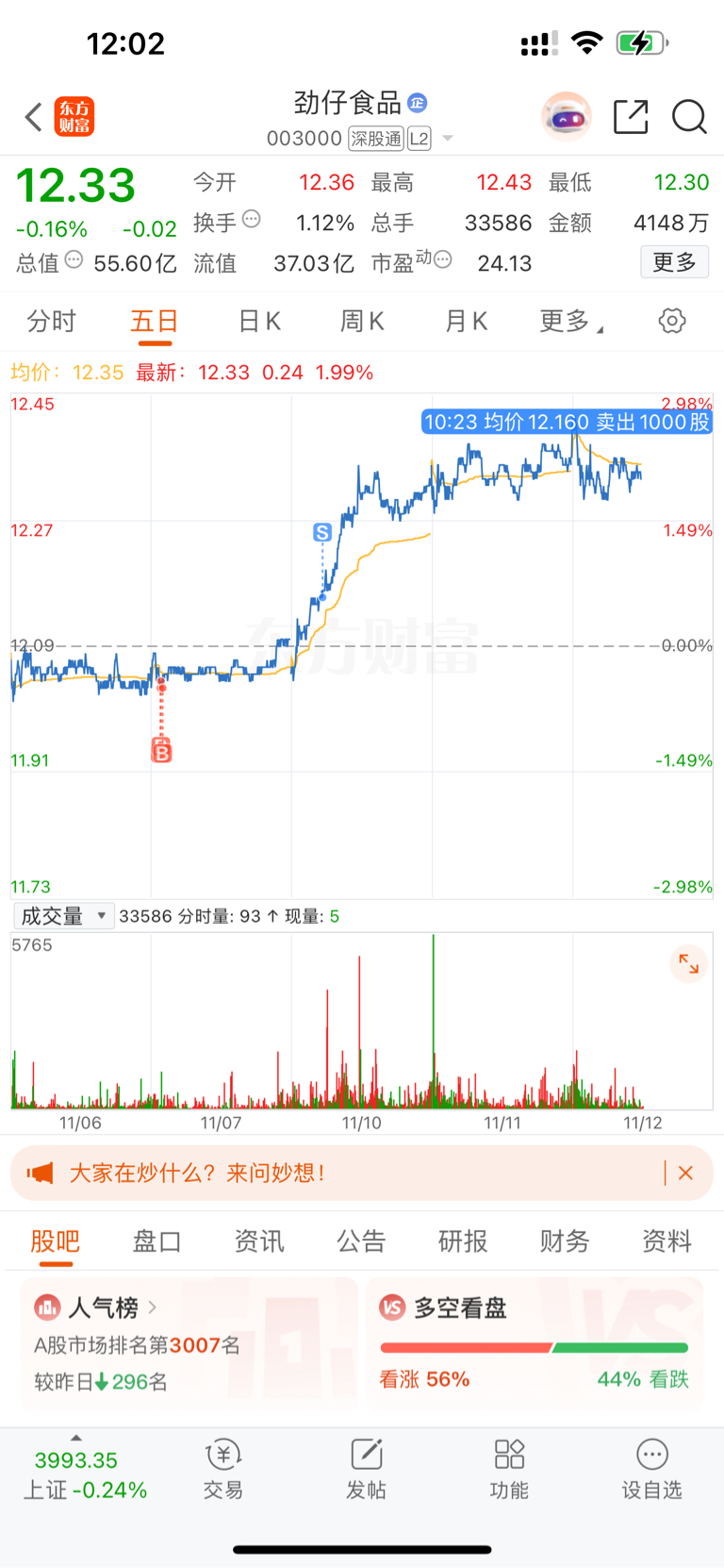 $劲仔食品(SZ003000)$ 刚进来没几天,发现这股还真的稳定呢,还有一百手继续观察吧