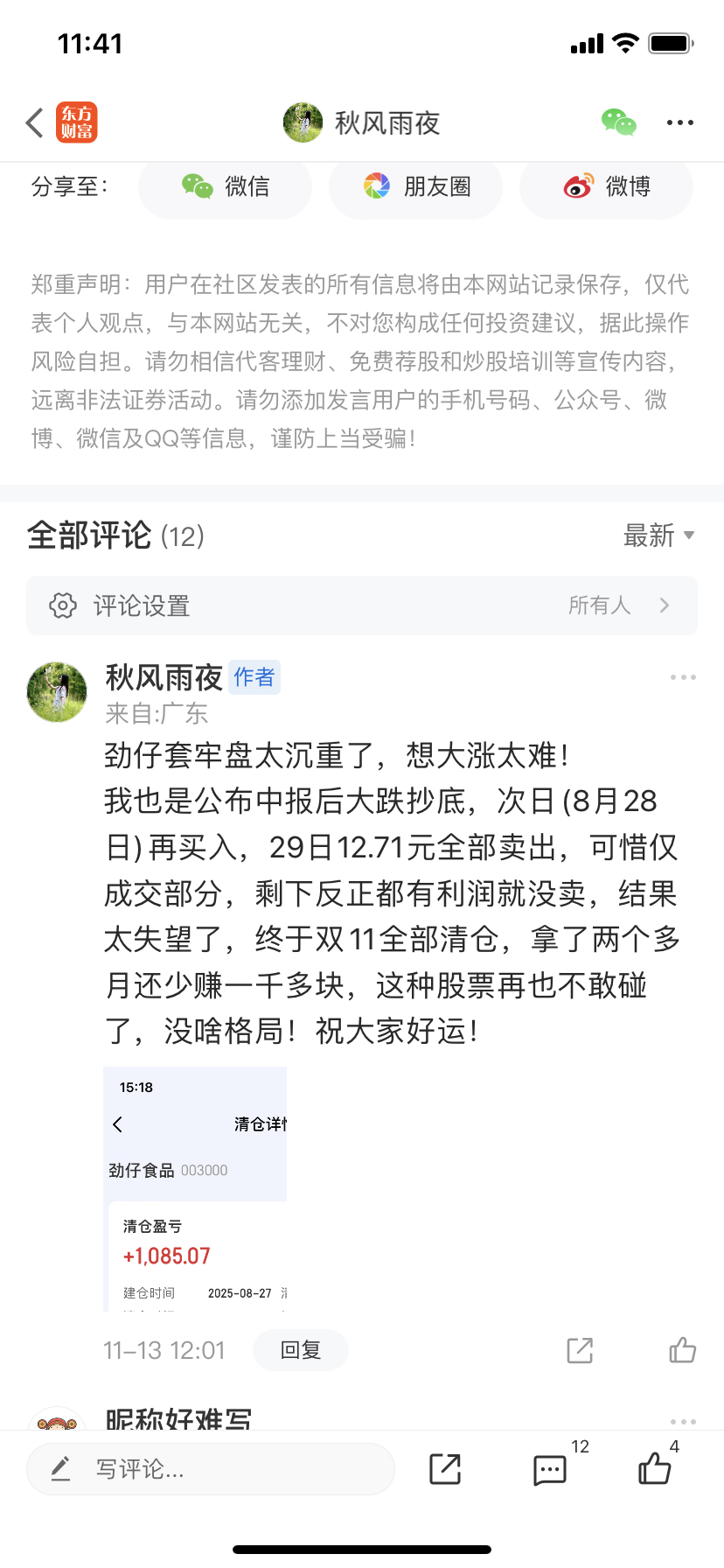 $劲仔食品(SZ003000)$ 大佬们记住:卖出去就千万别回来!