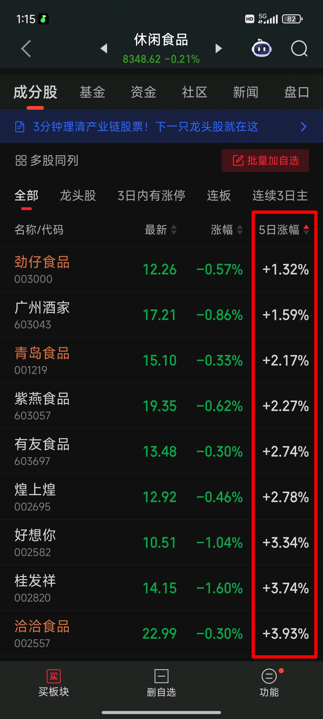 $劲仔食品(SZ003000)$ 休闲食品板块五天涨幅倒数第一