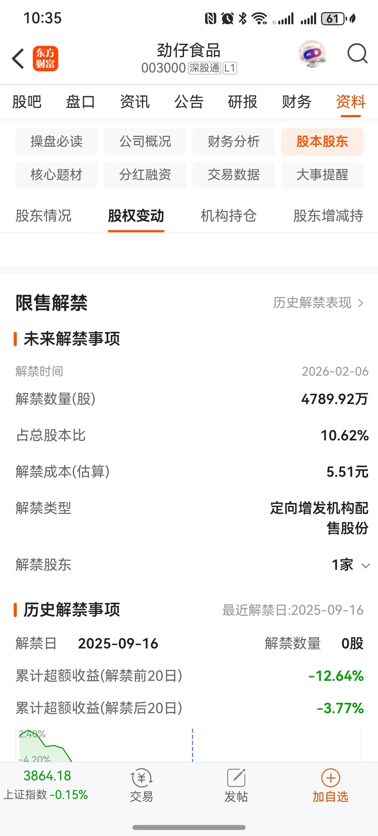 $劲仔食品(SZ003000)$ 本来想买点,看到明年2月份的解禁股,被成功劝退