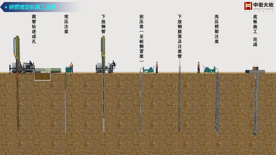 前后压浆钢管微型桩加固施工工艺采用中岩大地自研设备机械钻孔、钢管回转钻进、泥浆护壁成孔。注浆过程中,先下注浆管(注完后拔出)进行首次常压注浆,然后在钢管孔口加注浆塞进行第二次压力注浆(前压浆),最后埋置注浆管进行第三次噼浆(桩底后压浆)。该技术利用桩身作为钻杆,实现成孔即成桩,施工高效;并通过前后压浆工艺,有效提升桩身承载力,性能显著优于普通钢管桩。