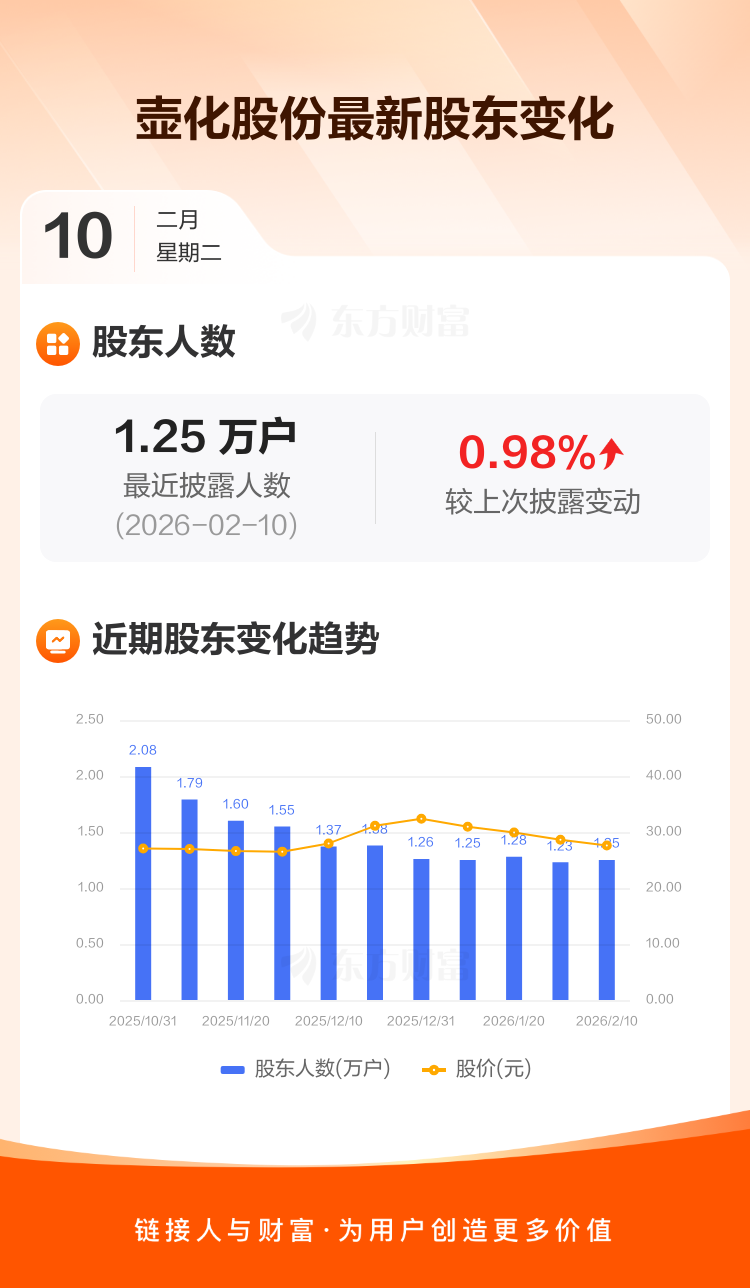 壶化股份:截至2月10日最新股东户数1.25万户,较上期增加0.98%