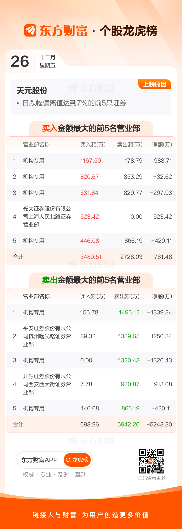 交易所2025年12月26日公布的交易公开信息显示,天元股份因成为日跌幅偏离值达到7%的前5只证券上榜。天元股份当日收报13.86元,涨跌幅-10.00%,偏离值-10.32%,换手率26.84%,成交额4.46亿。