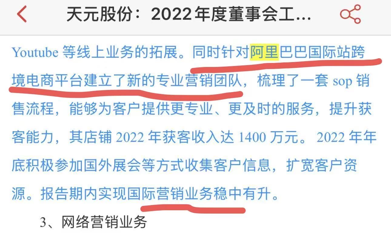 阿里板块强势,阿里电商板块涨停潮,天元股份:公司针对阿里巴巴国际站跨境电商平台建立了新的专业营销团队,梳理了一套 sop 销售流程,能够为客户提供更专业、更及时的服务,提升获客能力,其店铺 2022 年获客收入达 1400 万元。 2022 年年底积极参加国外展会等方式收集客户信息,扩宽客户资源。报告期内实现国际营销业务稳中有升。
