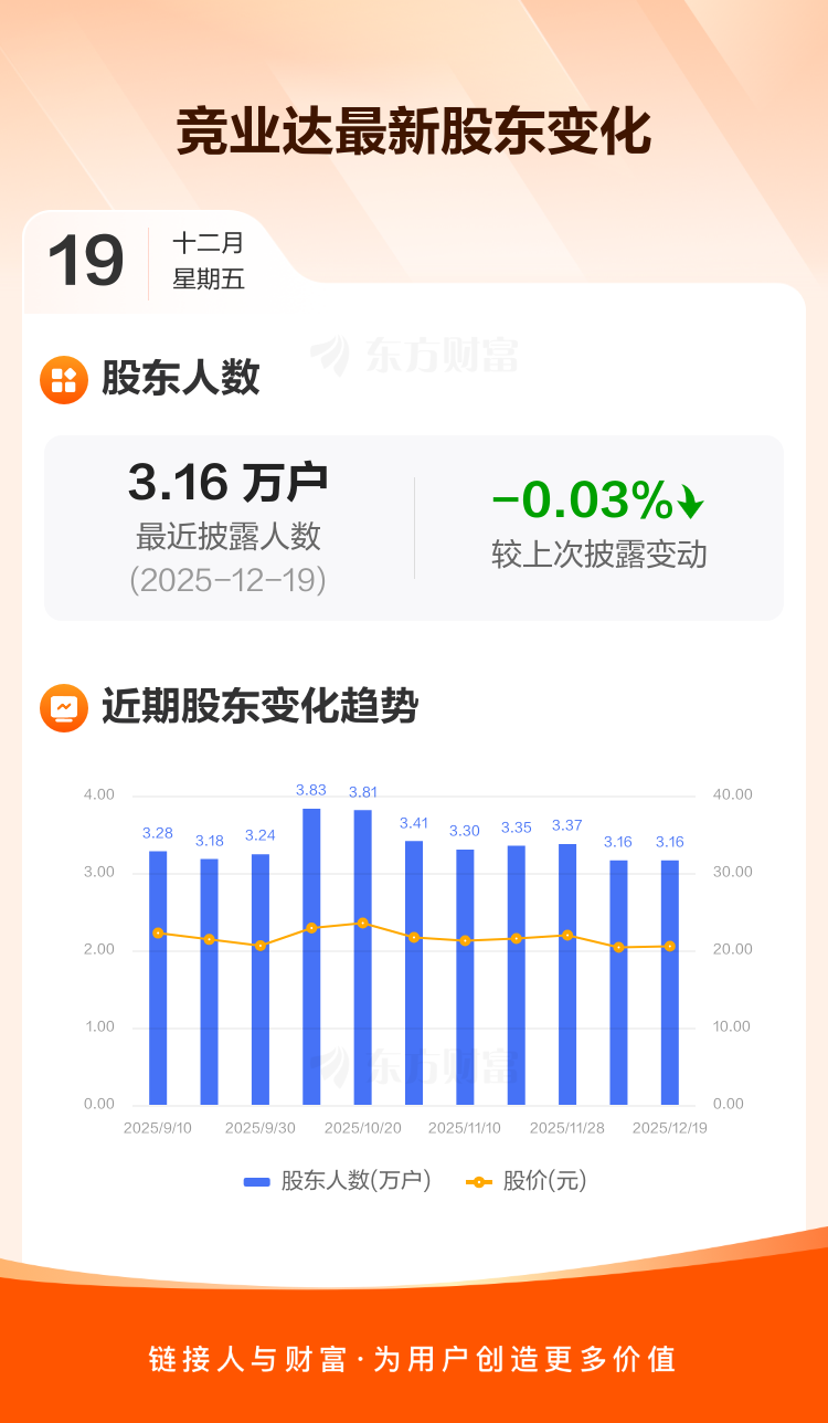 竞业达最新披露数据显示,截至12月19日公司股东户数为3.16万户,较上期(2025年12月10日)减少9户,降幅为0.03%。户均持有流通股数量由上期的4019股上升至4020股,户均持股金额由上期的8.18万元增加至8.25万元。